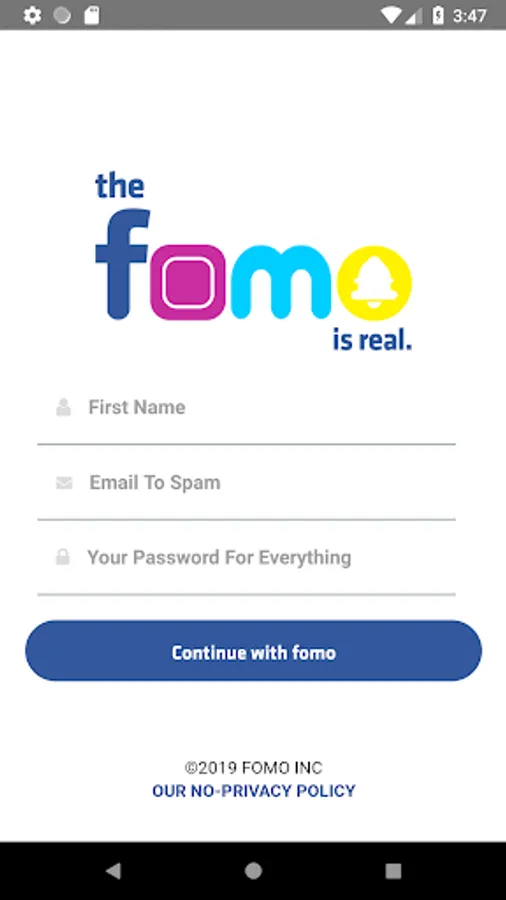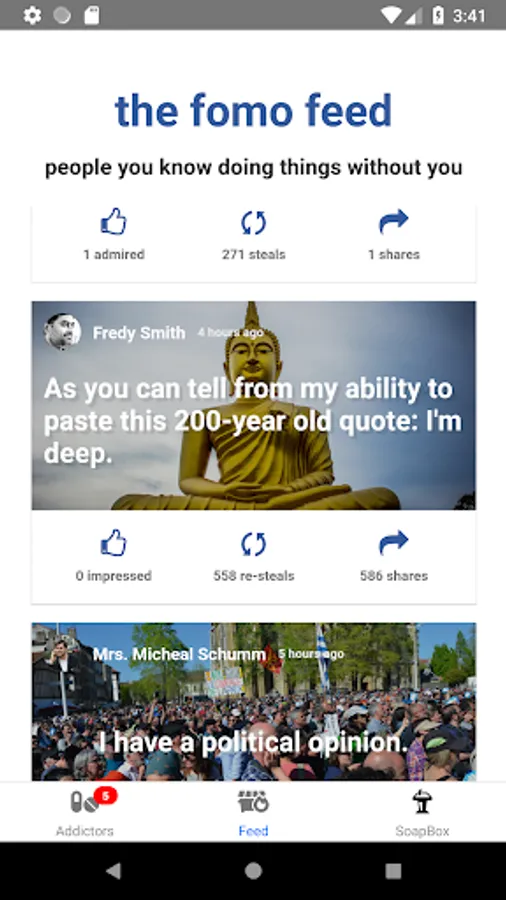 fomo is a parody app built by Fabriq with the intention of "revealing and educating users on the dark side of society's addiction to social media, by presenting brutally-honest representations of the features we've come to expect from our favorite apps along with why the developers build them this way, and how we're actually using them—whether we realize it or not..."