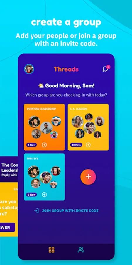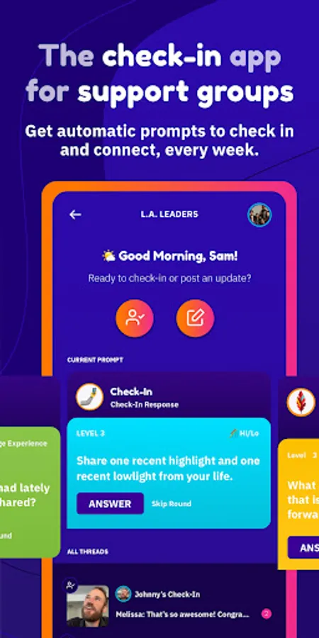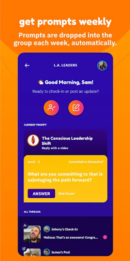 Designed for groups dedicated to social support, Threads is the app for checking-in with your group between live sessions. Members stay connected to the work and to each other via. audio and video responses to curated prompts, delivered automatically each week, because consistent accountability and support is the key to success.