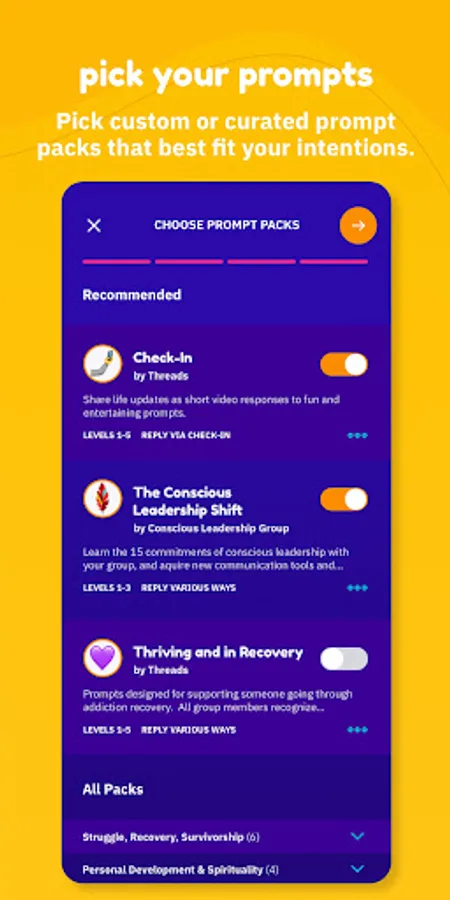 Choose the prompt packs that best fit your group’s needs. Or, create a custom pack!