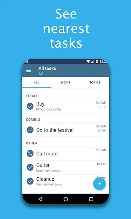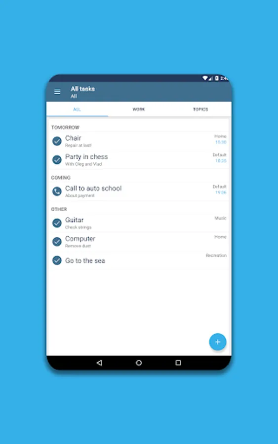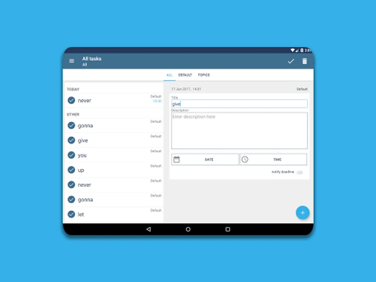 Allows you create сonvenient and informative notes, notifications, tasks and lists. Create topics for tasks. Organize and sort.