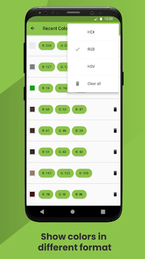 - Show colors in 11 different formats! (HEX code, RGB, CMYK, HSV, HSI, HSL, HSP, HSB, LAB, OKLAB, XYZ)
