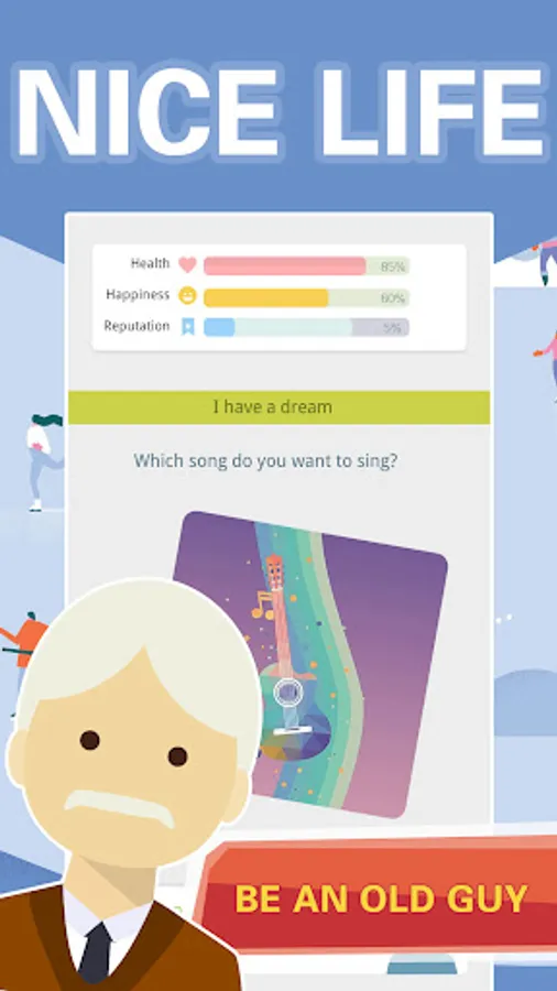 The game is very easy to play, just use your thumb to swipe the cards to the left or right to make different choices and move the story forward. Keep an eye on your attributes, as the game ends when they reach zero. "Chinese Old Man Simulator" is easy to play, casual and fun, but challenging.
