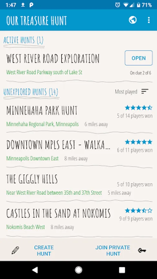 Find and join public and private treasure hunts near you. Solve them while exploring your surroundings.