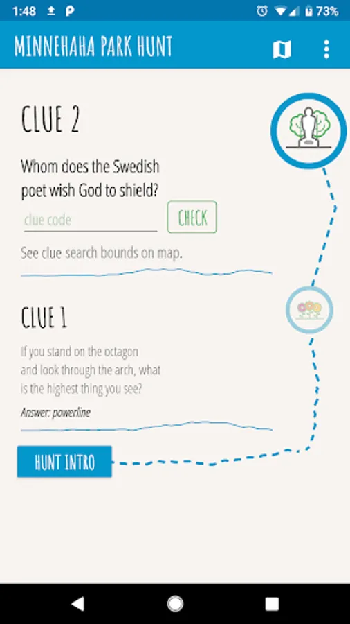 The app also features a map of all hunts, distinctive artwork, pages for profile, completed games, leaderboards, game rules, browsing hunt details, reviewing hunts, reporting problems and more.