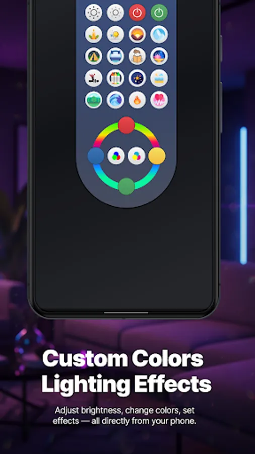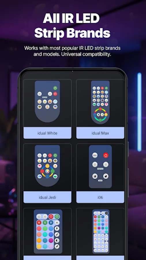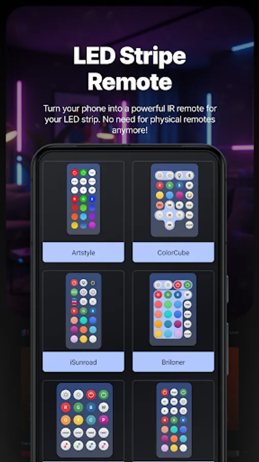 Control your RGB lights with your smartphone using this simple and powerful app. Designed for IR-supported phones, it allows you to manage RGB lights, adjust brightness, change colors, and even replace a lost RGB LED controller Bluetooth or traditional LED remote. Whether you're looking for an RGB app to control your RGB light controller or manage your RGB bulb remote, this app has you covered. With an easy-to-use interface and night mode, you can conveniently control your LED strip lights, lamps, or other RGB app control devices.