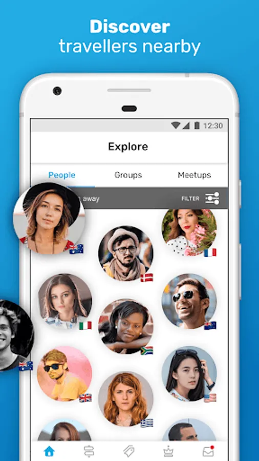 • Nearby Screen "Find" - search and connect to thousands of travelers in your area or at a future destination.