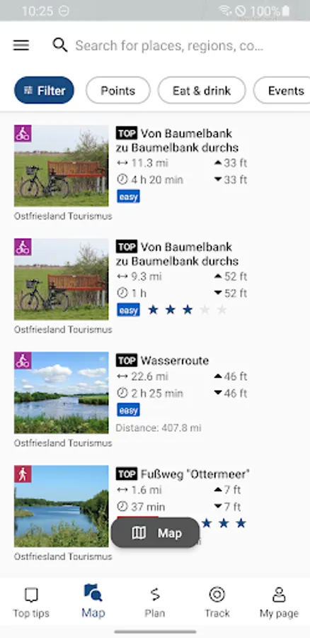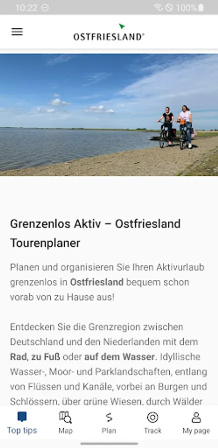 The app "Grenzenlos Aktiv - Ostfriesland Tourenplaner" is your practical holiday planner - for planning in advance from home or directly on site. It not only has over 500 suggestions for hikes, cycling tours and canoe trips, but also a large selection of accommodation options. In addition, there are numerous valuable tips for excursion destinations such as mills, lighthouses, museums, spas or island excursions. With the Top Tips you get a first-hand compilation of the most beautiful tours.
