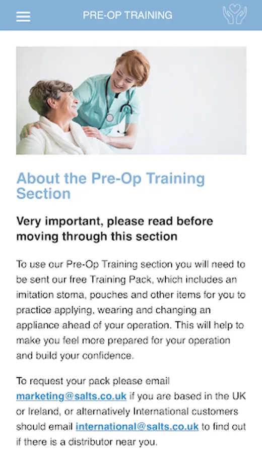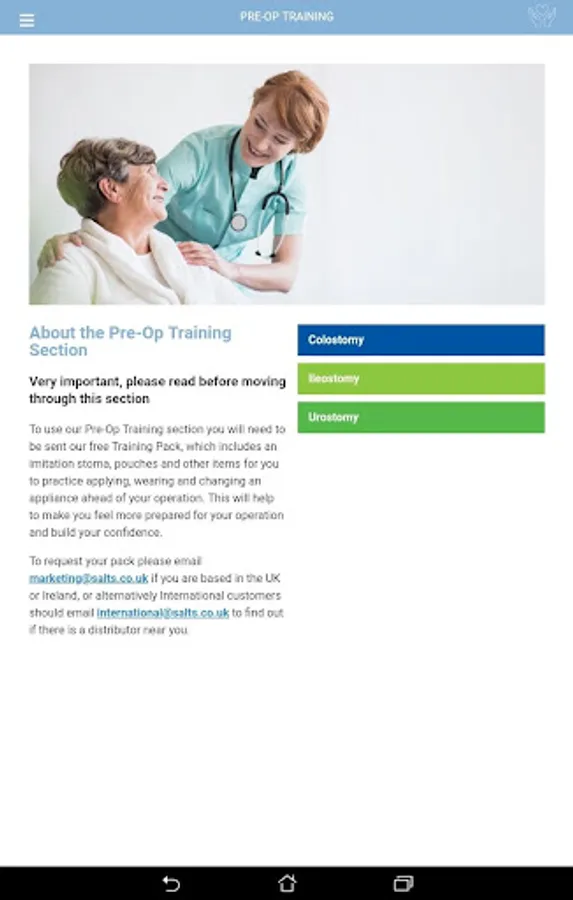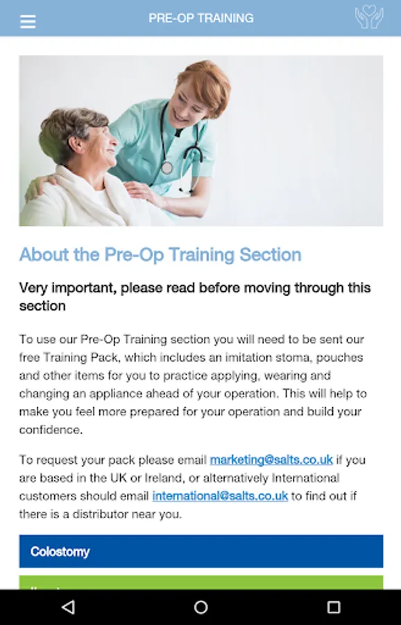 The Salts Healthcare Stoma Training App gives you all the information you need whether you’ve just found out you will need to have a stoma, recently had your operation, or are living with a stoma. It is also a useful tool for those caring for and supporting a relative or friend.