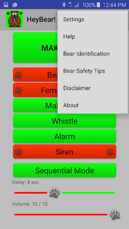 HeyBear! provides a number of progressively assertive voices and sounds: bear bells, female voice, male voice, whistle, alarm and siren. There are four audio clips for each of these sound categories and they can be played sequentially or randomly. Multiple categories can be selected, so you can customize a variety of sounds.