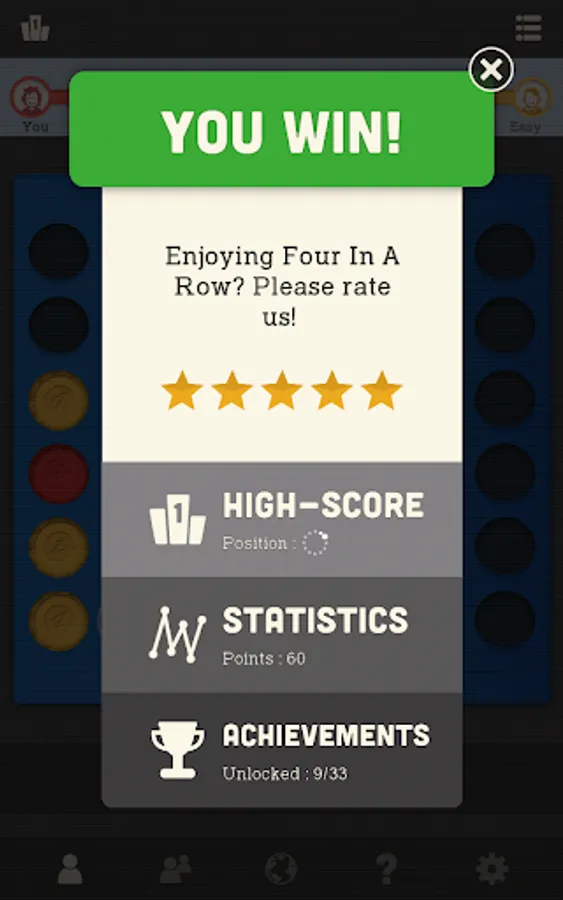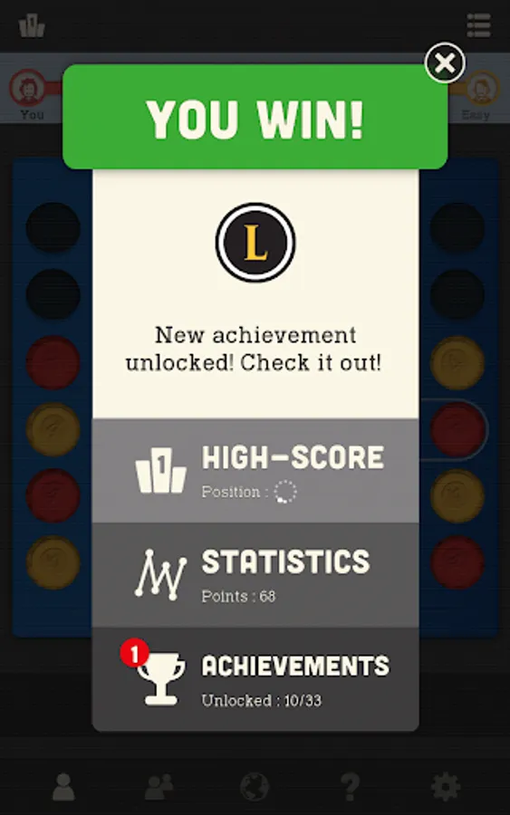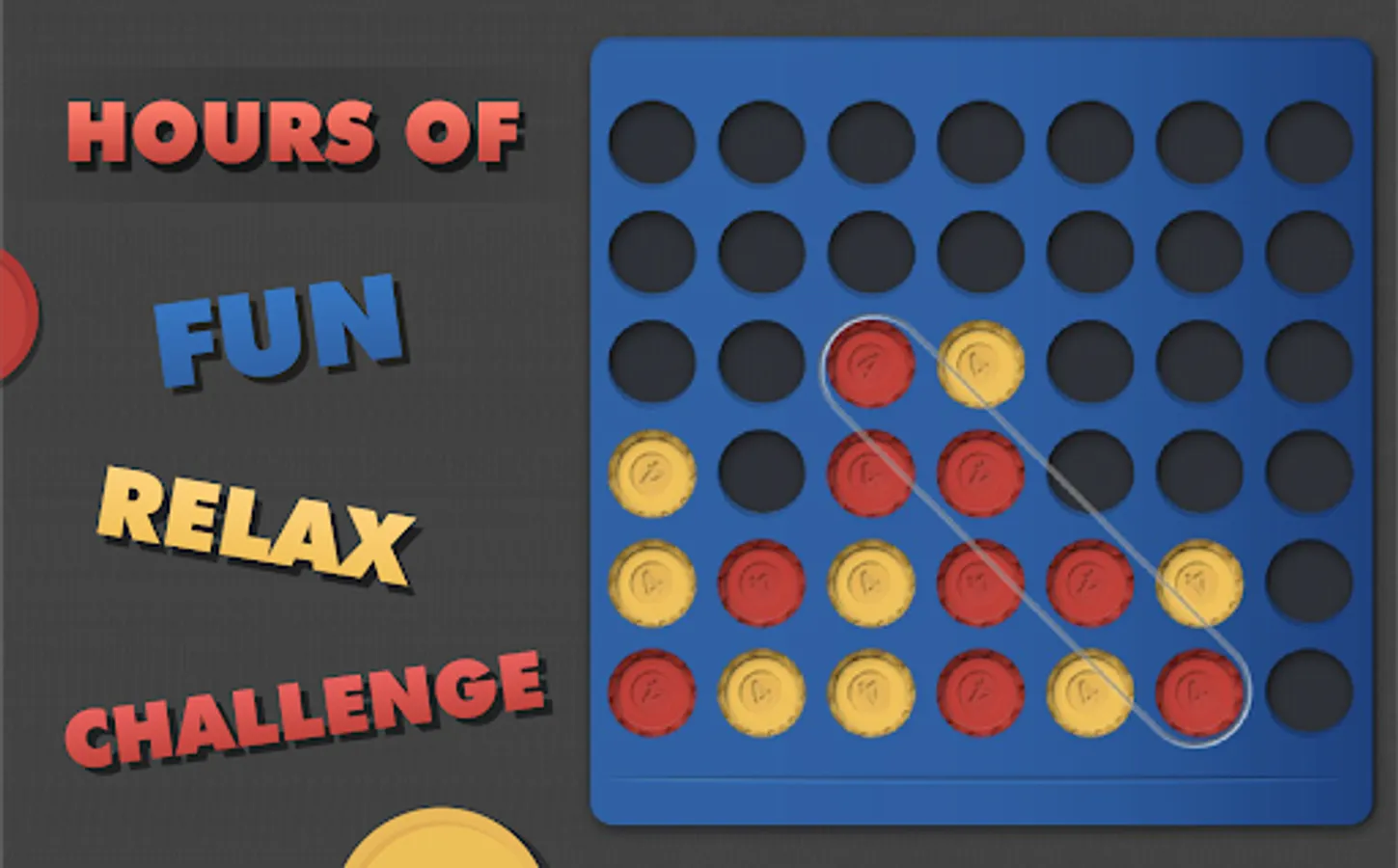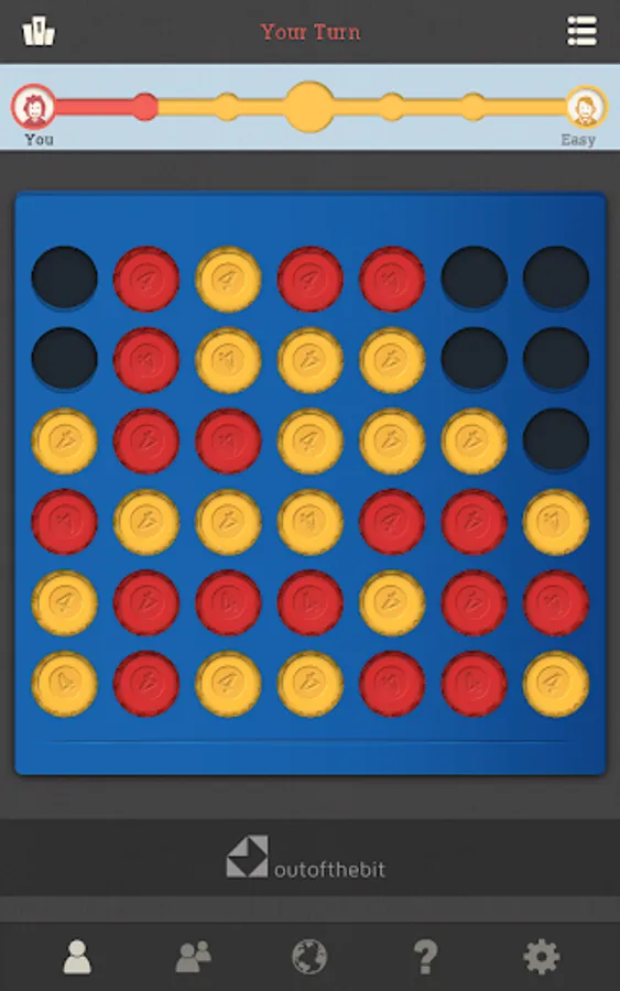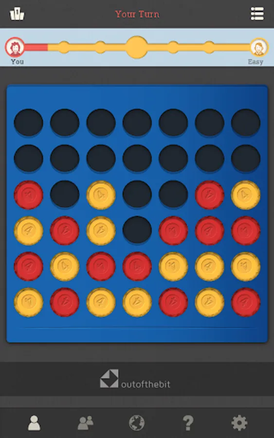 Connect 4 pieces of your colour in a line before your opponent. The popular game is now in your hands every time you can spare a moment for a challenge or a bit of relax. Excellent for testing your skills or teaching strategy to kids. Play multiplayer with a friend or try to beat our well-trained virtual players and see your improvements game by game.
