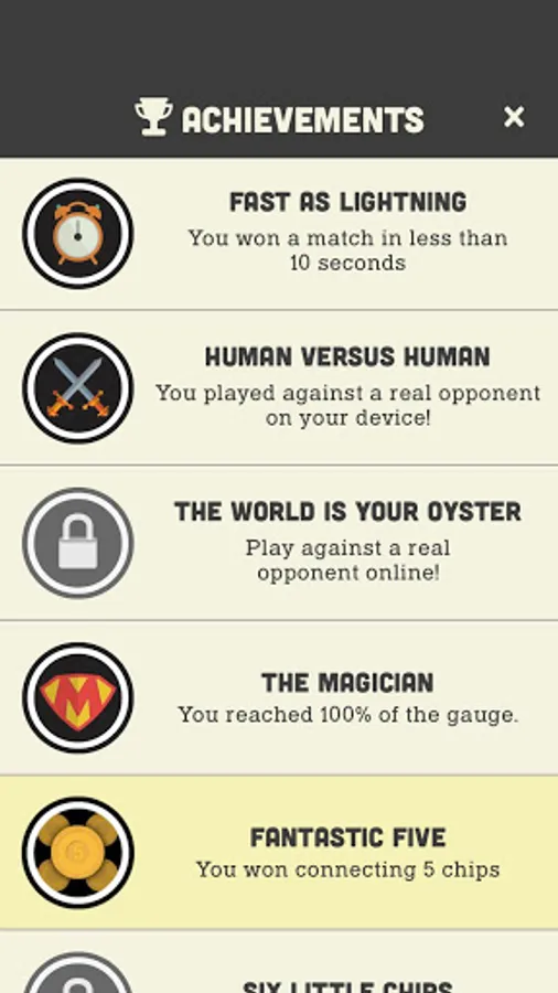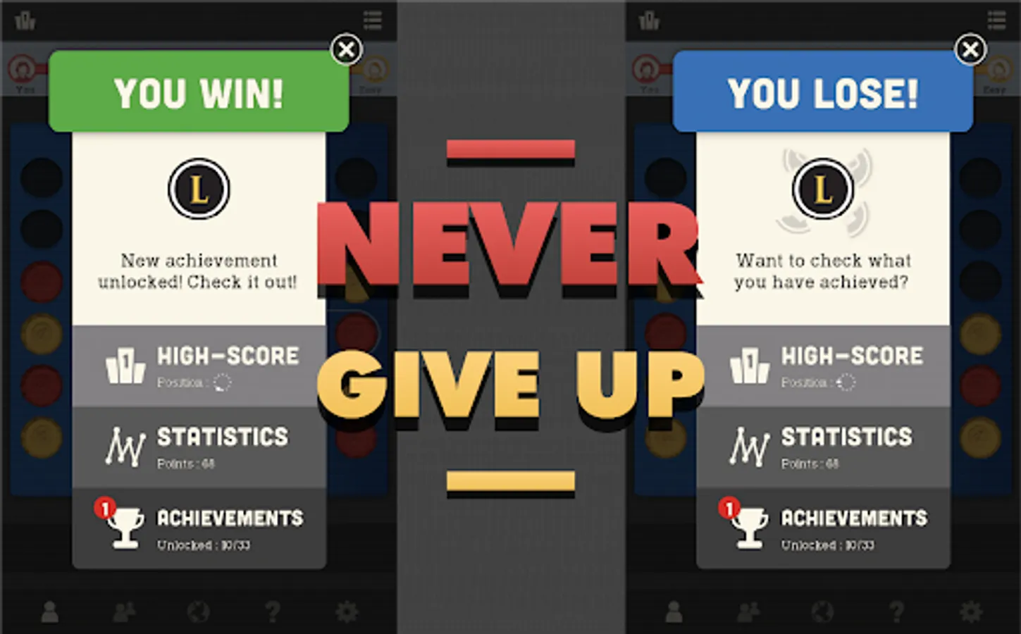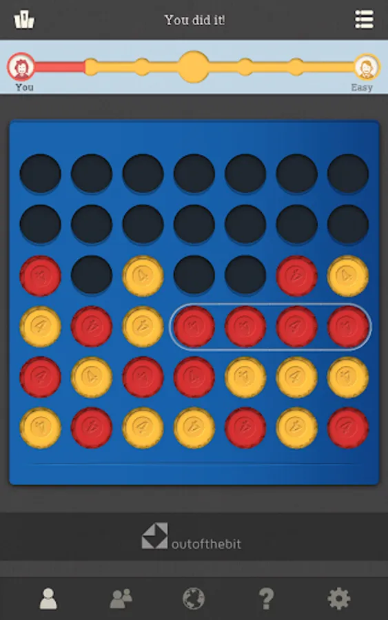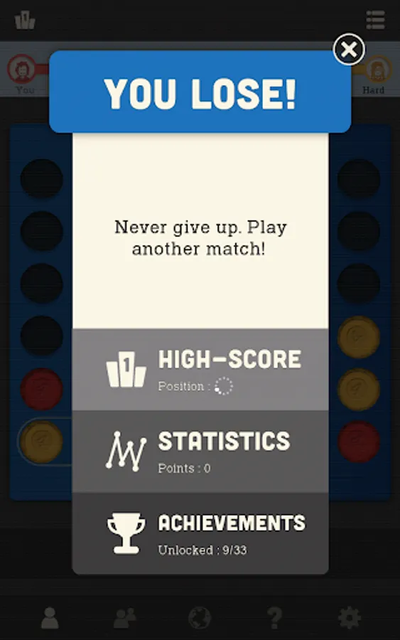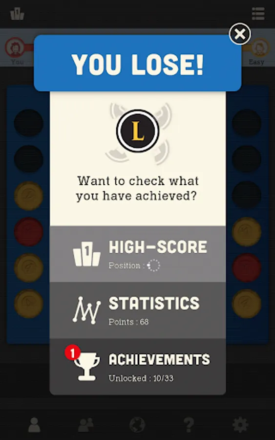 Connect 4 pieces of your colour in a line before your opponent. The popular game is now in your hands every time you can spare a moment for a challenge or a bit of relax. Excellent for testing your skills or teaching strategy to kids. Play multiplayer with a friend or try to beat our well-trained virtual players and see your improvements game by game.