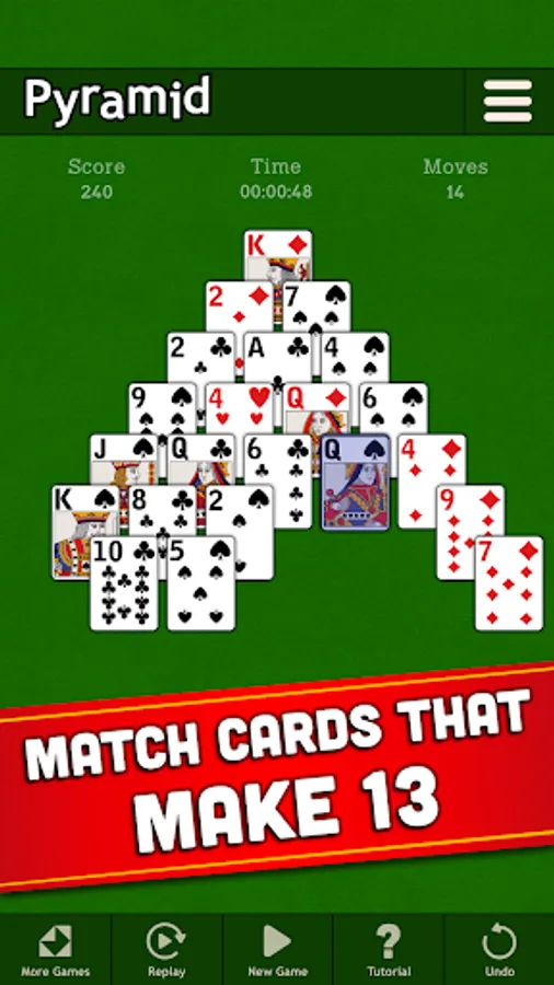 Easy to play: just touch 2 cards that make 13 (Q+Ace, J+2,10+3 and so on) and clear the pyramid of all its cards.