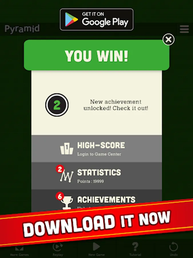 Add Pyramid to your collection of classic card games and you’ll have a great puzzle that is easy to play and re-play. For an additional challenge, try to beat the score of the other players in the leaderboard or replay a match to better your time or solve it in less moves.