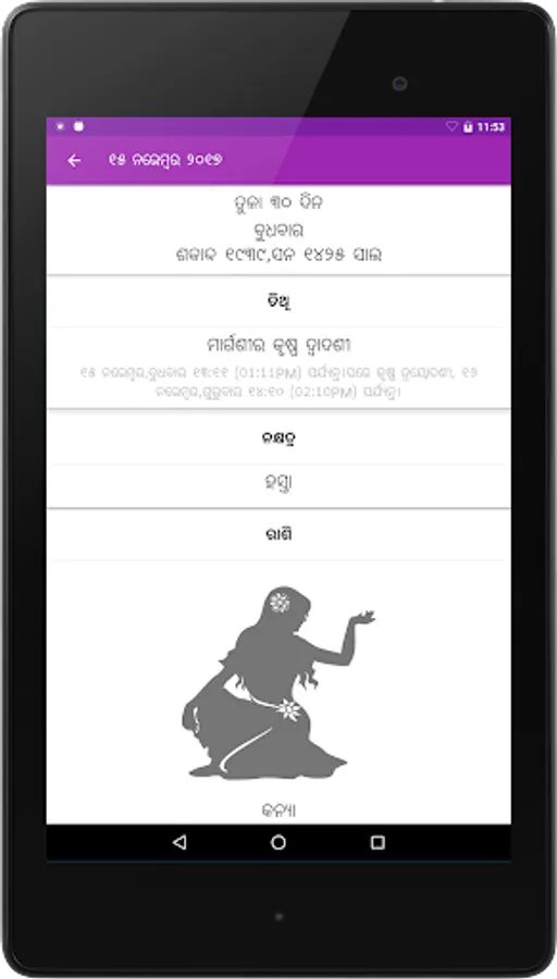 The calendar covers important days . The application also comes with a details screen per day that shows you all the 'Panjika' details for a given date . You can navigate to the details screen by clicking on a given date in the Calendar .
