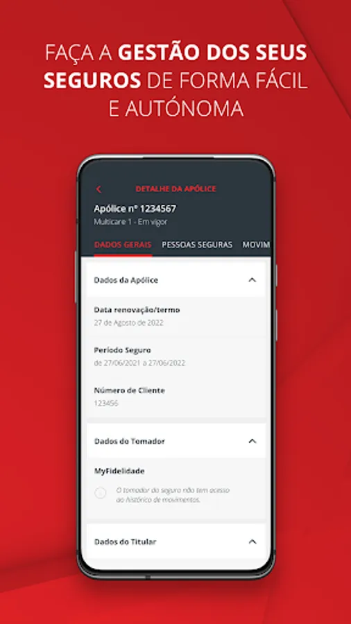 The MyFidelidade customer area was created with your needs in mind and to help you simplify your day-to-day. With the app you can manage your Health, Auto, Home, Life and Personal Accident insurance, wherever and whenever you want, through access to its details and main features. For the remaining insurances, you will be able to consult your documentation.