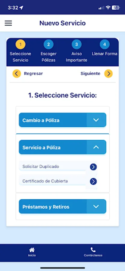 Requisar Servicio a Su Póliza, Comprar Póliza o Actualizar Su Perfil.