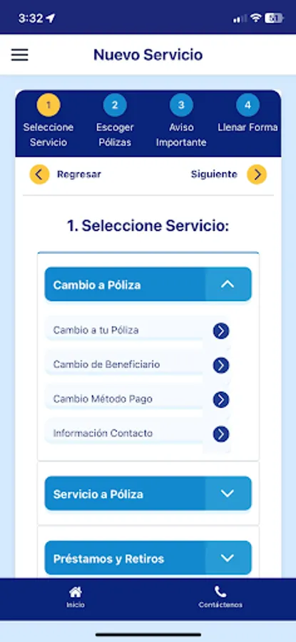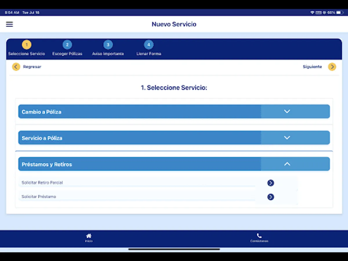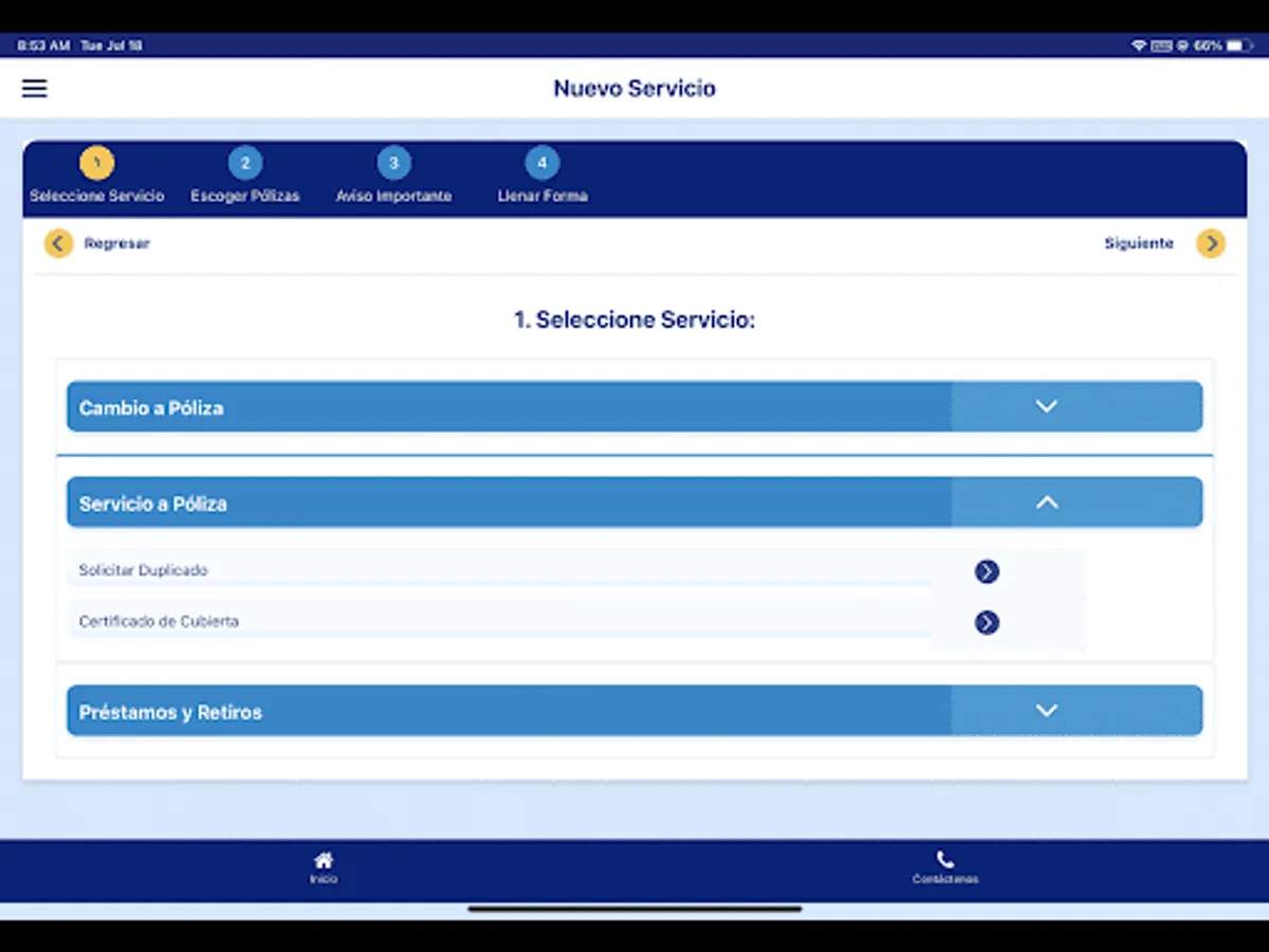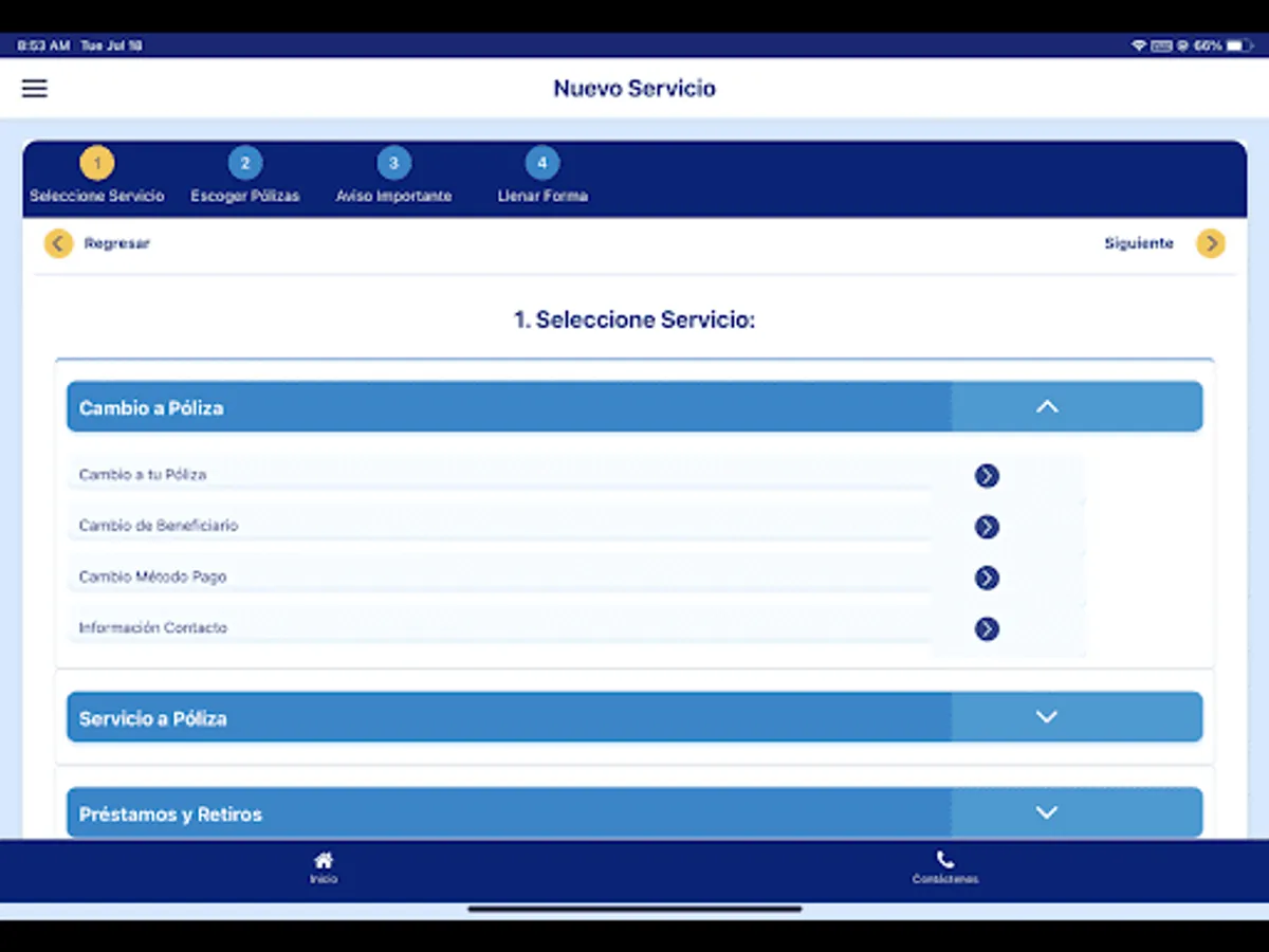 1. Consultar información de tus Pólizas, incluyendo historial de pagos, cubierta básica y suplementos, fecha de vencimiento, valores acumulados, balance de préstamo, método de pago, frecuencia de pago, notificaciones, etc.