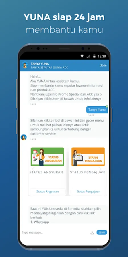 Integrasi Chatbot kami siap sedia membantu Anda menemukan apa yang Anda butuhkan 24/7 melalui YUNA (Your Virtual Assitant).