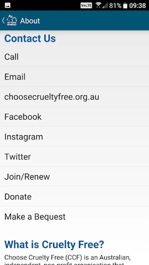 Choose Cruelty Free (CCF) is an Australian, independent, non-profit organisation that produces the Choose Cruelty Free List (CCF List), actively campaigns for a ban on animal-tested cosmetics, and promotes a cruelty-free lifestyle. The CCF List helps consumers choose products made by companies that do not test on animals.