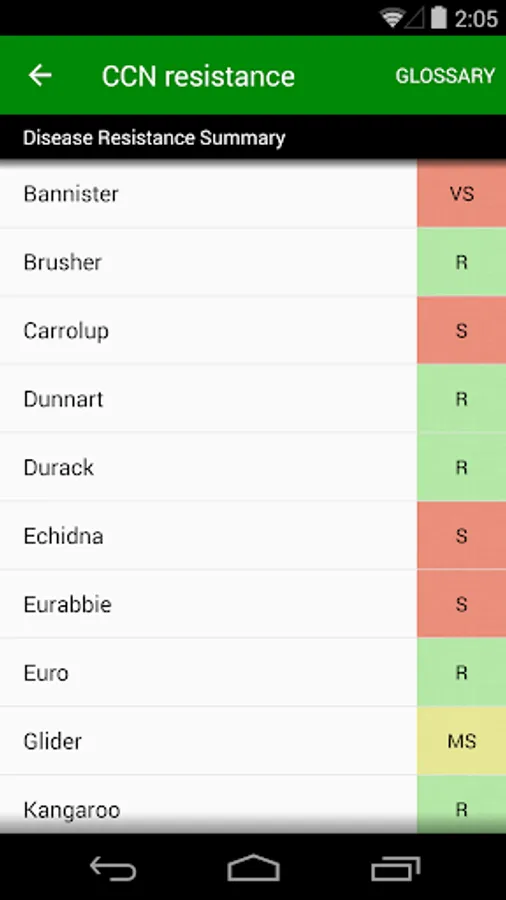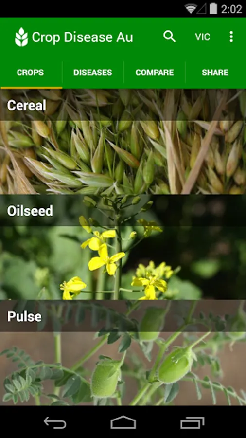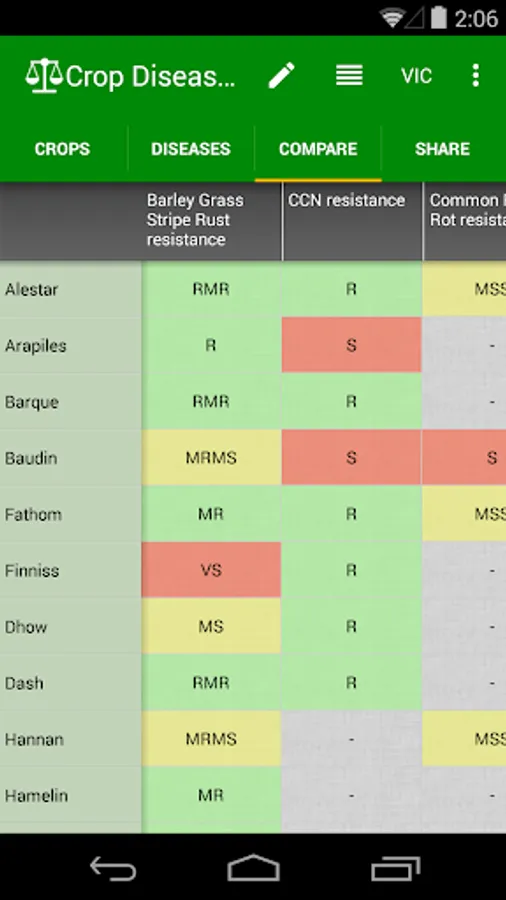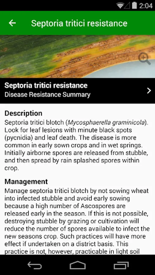Compare the resistance ratings of wheat, barley, canola, chickpea, faba bean, field pea, lentil, lupin, oat and triticale for a range of different diseases. Compare disease symptoms with photographs and access detailed descriptions of each disease with management controls. Explore detailed information on crop varieties, map diseases, and automatically share photographs with friends or colleagues via email.