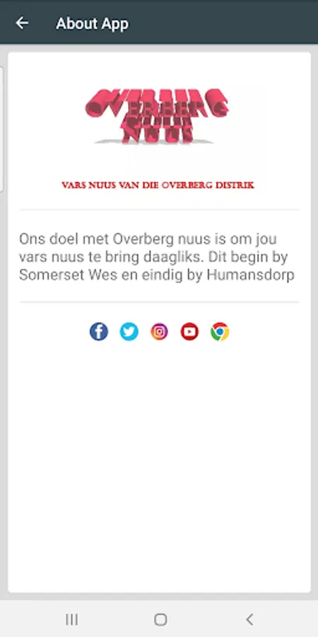 n Hartlike welkom by Overberg nuus soos julle weet probeer sekere seksies om afrikaans uit te laat sterf. Als word nou aangebied in engels. Afrikaans het nou n duur middel van kommunikasie geraak en jy moet basies aansluit met n fooi om afrikaanse nuus te kry. Wel dit bevorder nie afrikaans om fooie te betaal in onder gemiddelde gemeenskappe vir daaglikse nuus nie. Alhoewel ons verstaan om kwaliteit stories te ontgin kos geld en goeie joernalistiek wat bedryfskoste meebring. Ons op die anderkant betrek mense in hoofsaaklik afrikaans sprekende areas sodat hulle hul eie stories kan vertel. Die stories word dan korrek oorgedra op hierdie medium om maksimum mense te bereik. Ons hoop u sal n bydra het om afrikaans te bevorder deur hierdie app af te laai en te geniet.