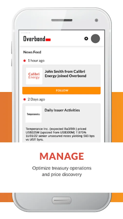 The Overbond app keeps your finger on the pulse of the primary bond market with the same market news, data and deals that you access on our web platform or desktop application. Leverage COBI™, our proprietary machine learning algorithms, to discover new fixed income investment opportunities anywhere and on the go. Enhance your relationships with bond issuers and bond investors through real-time updates and transparent marketplace analytics.