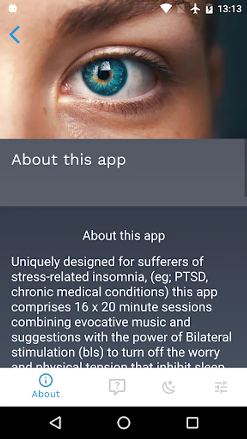 Uniquely designed for sufferers of stress-related insomnia, this app harnesses the power of bilateral stimulation (bls) and soothing words and music, to turn off tension and worry and restore normal sleep functioning. Bilateral stimulation is a treatment element of EMDR therapy, a psychological treatment method which harnesses your brains ability to process sensory information to de-activate the physical and mental distress which inhibits sleep. The resulting normalization of brain activity creates the conditions for sleep to happen, naturally and effortlessly. If you suffer from insomnia related to PTSD, medical problems or just general stress and anxiety this app is for you. This app works best with a good internet connection and a set of headphones.