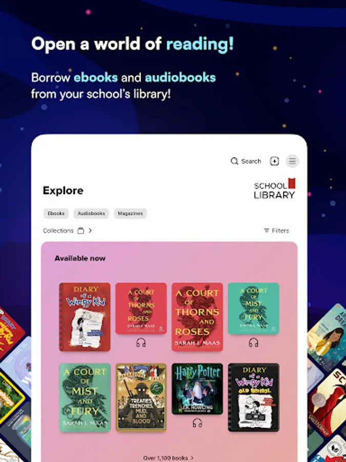 Borrow eBooks and audiobooks from your school's library with Sora. Setup is simple - just find your school and sign in. Then download or stream your assignments and favorite books to your device.