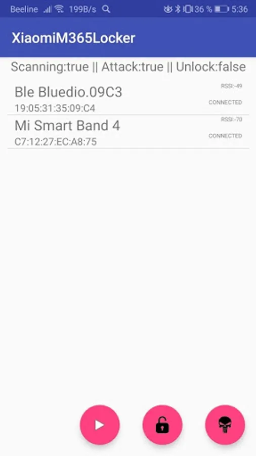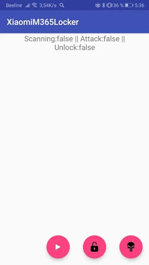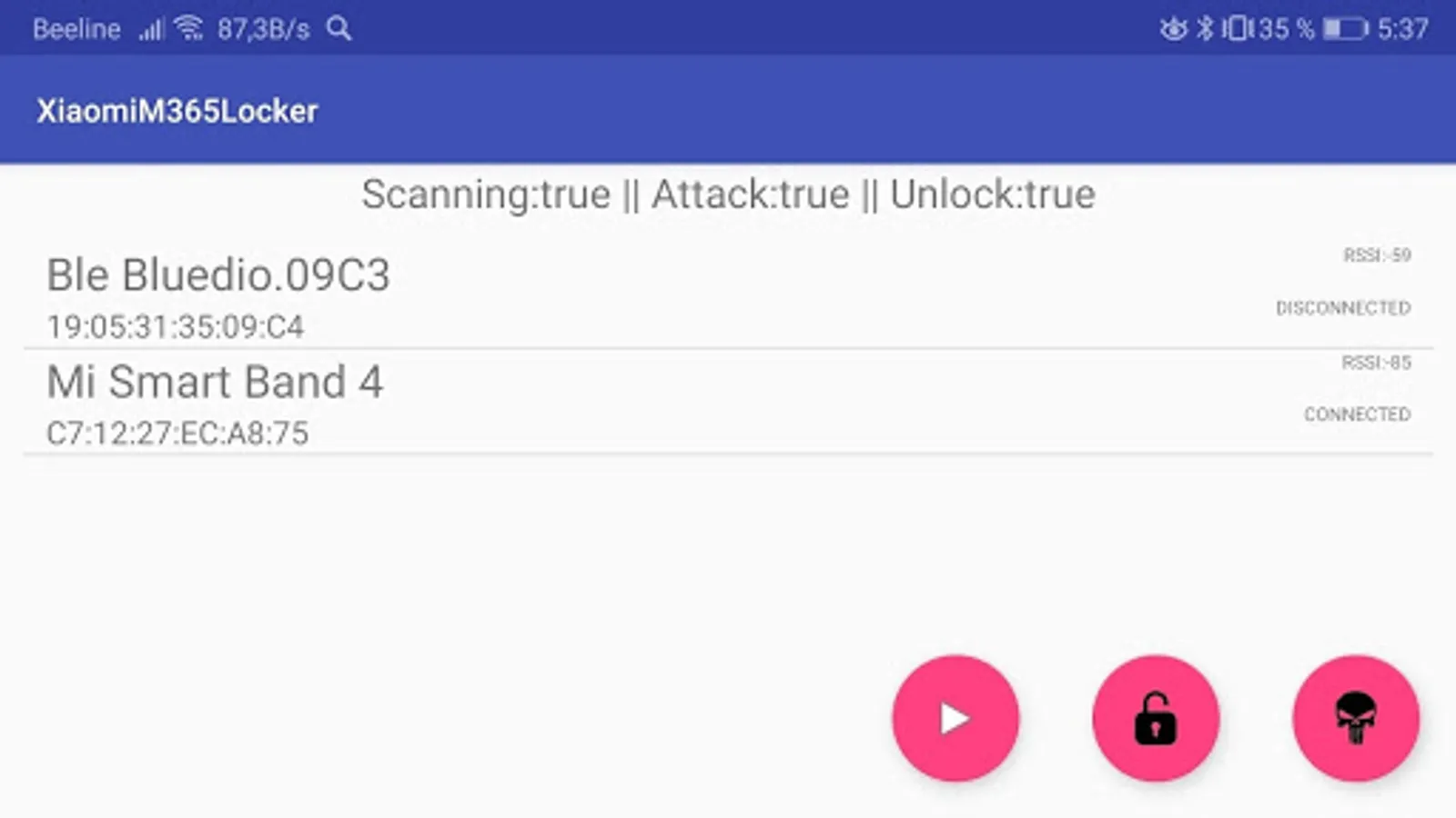 * Scan (triangle) - scans for nearby Bluetooth devices. If there is any Xiaomi scooter, it connects. (sometimes works for mi Band)