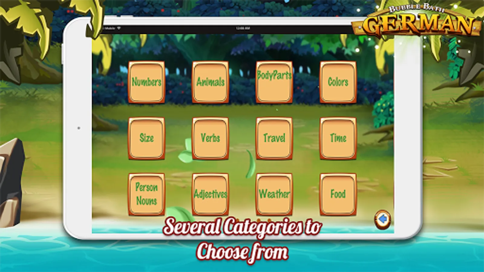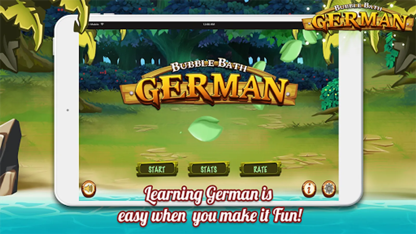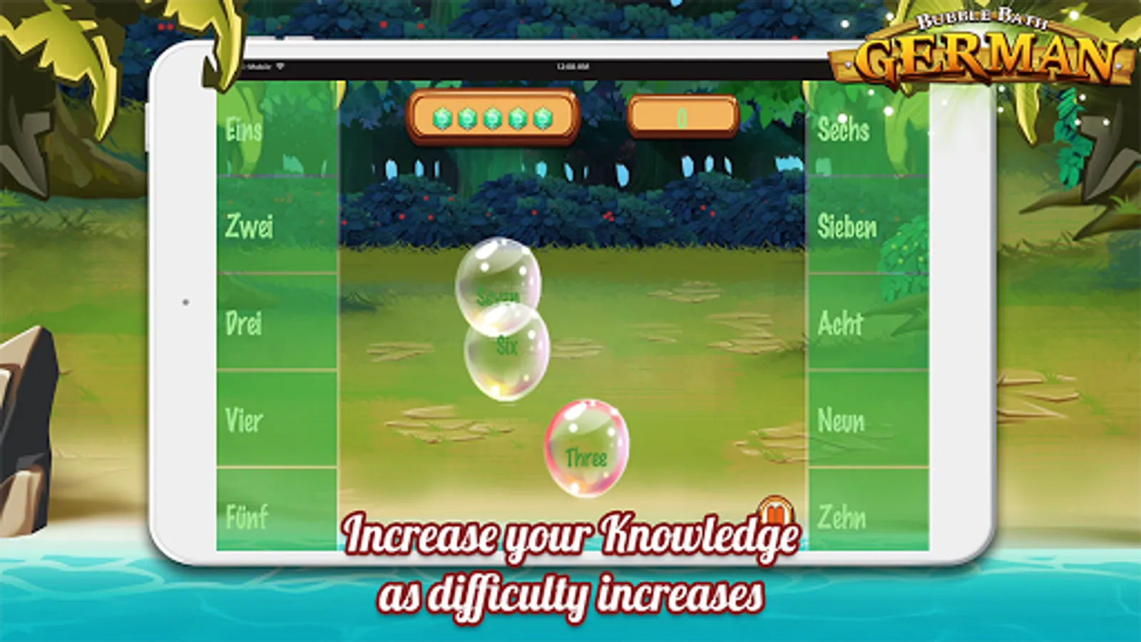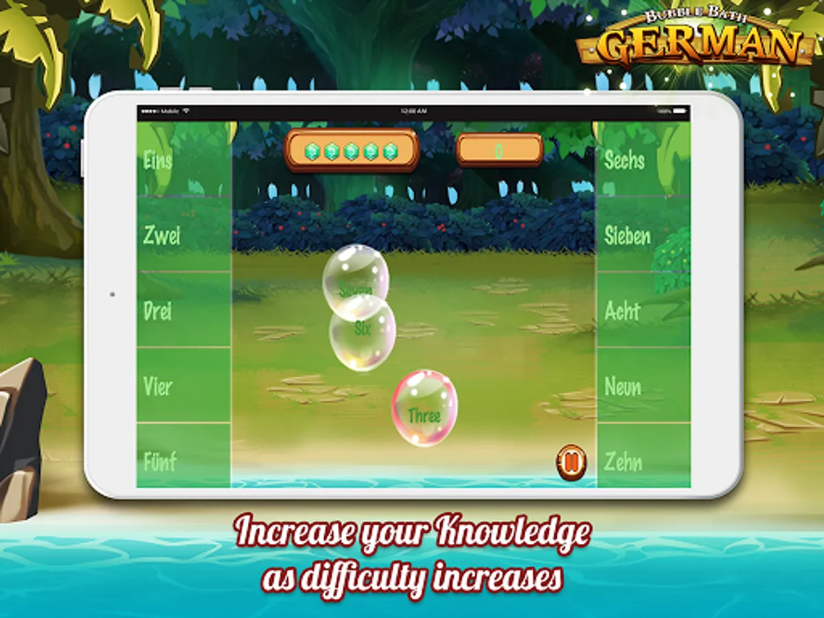 In this fun and engaging game, you practice listening to and reading German words and phrases. Each word floats in a bubble and you must tap on it and pop it by selecting the button with the translations.