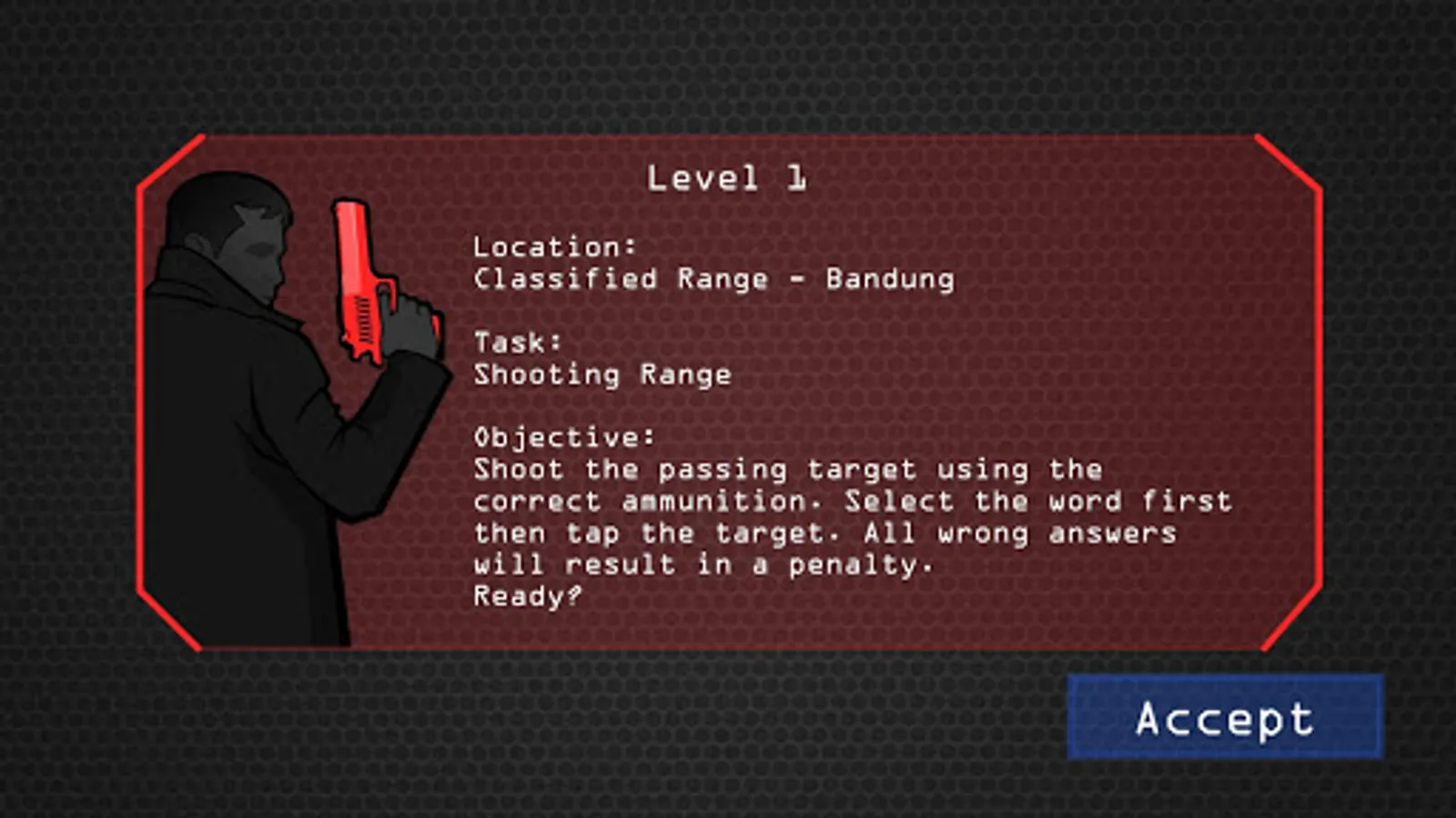 Once you accept your mission, you will be presented with a map that shows you the location of the training facilities across Indonesia where you need to sharpen your spy skills and learn Indonesian. Get through each of the level by successfully completing the tasks assigned and be prepared to detonate bombs, decode encrypted messages, shoot targets, and stop assassins.