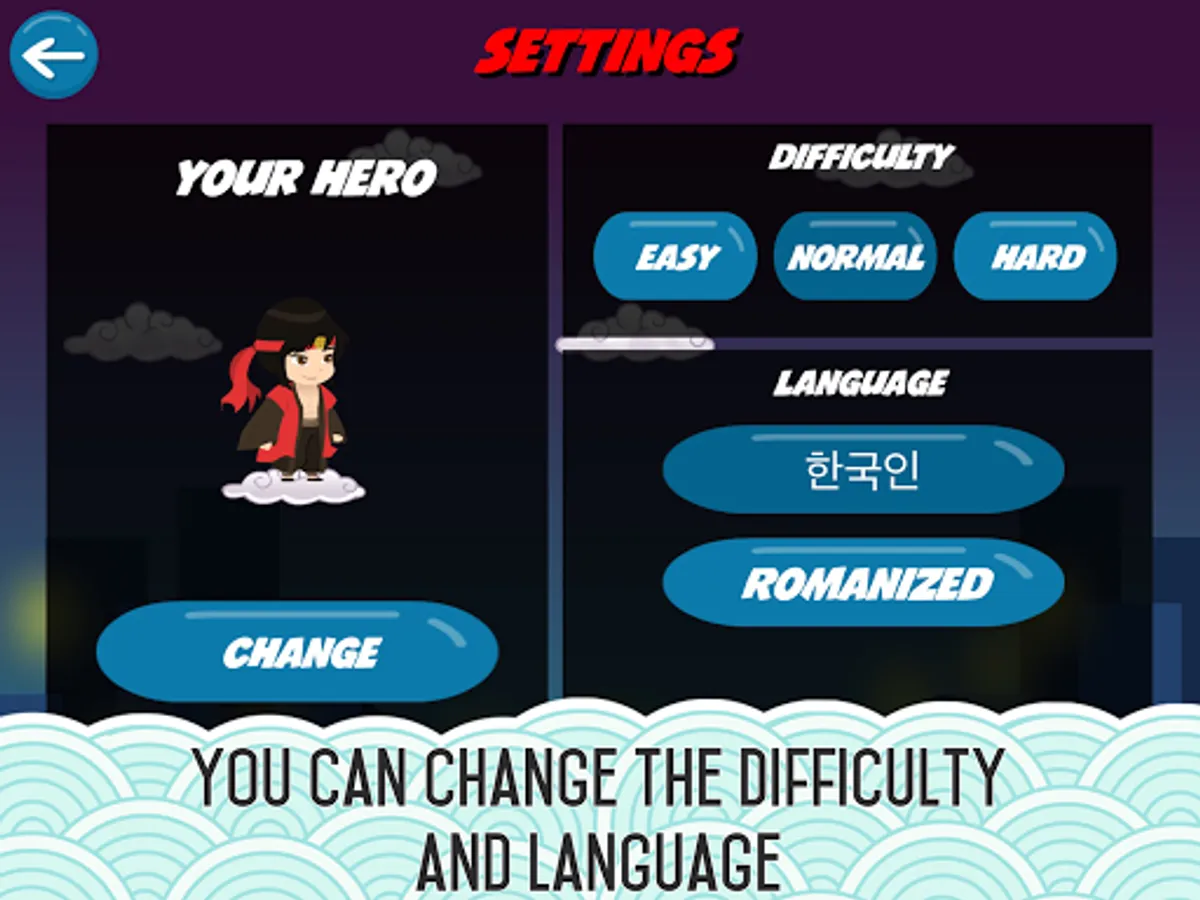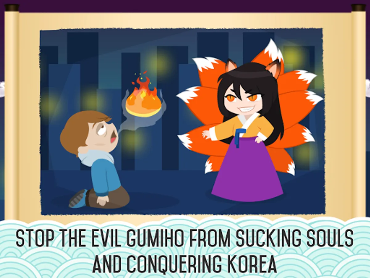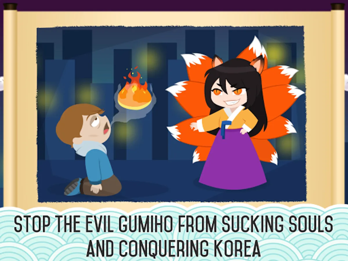 The Gumiho sends fireballs over Korea. Your hero must quickly translate the word or phrase provided and select the right fireball to destroy. In early levels, you can guess which fireball as you listen to the word spoken by a native speaker and try to read the Kanji. However, you must pay attention because this will get harder in later levels.