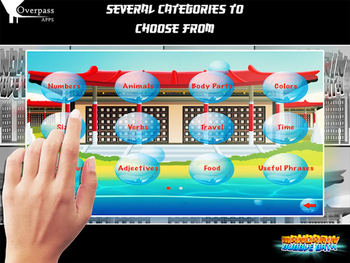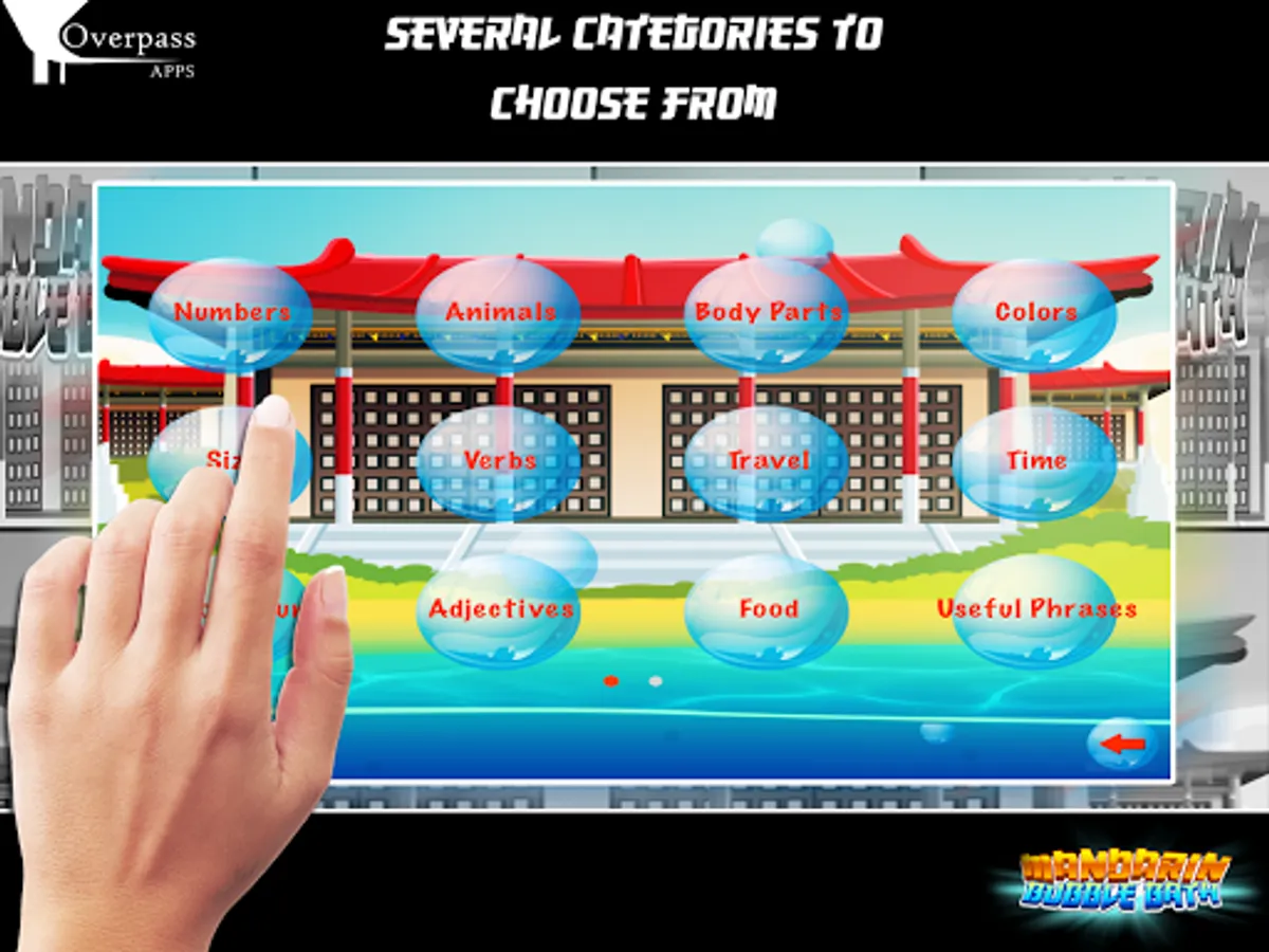 Mandarin Bubble Bath is arranged into 12 categories based on topics. Each category contains 10 Chinese words and phrases. The best area to start with is numbers.