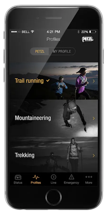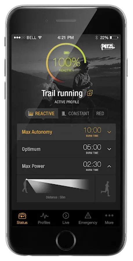 • Create your own lighting profiles or choose from among the Petzl presets: multiactivity, trail running, trekking, mountaineering, backpacking... Several lighting levels available for each profile, depending on your activity and needs.