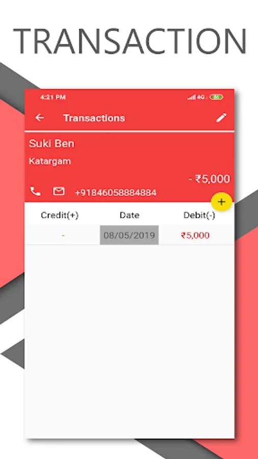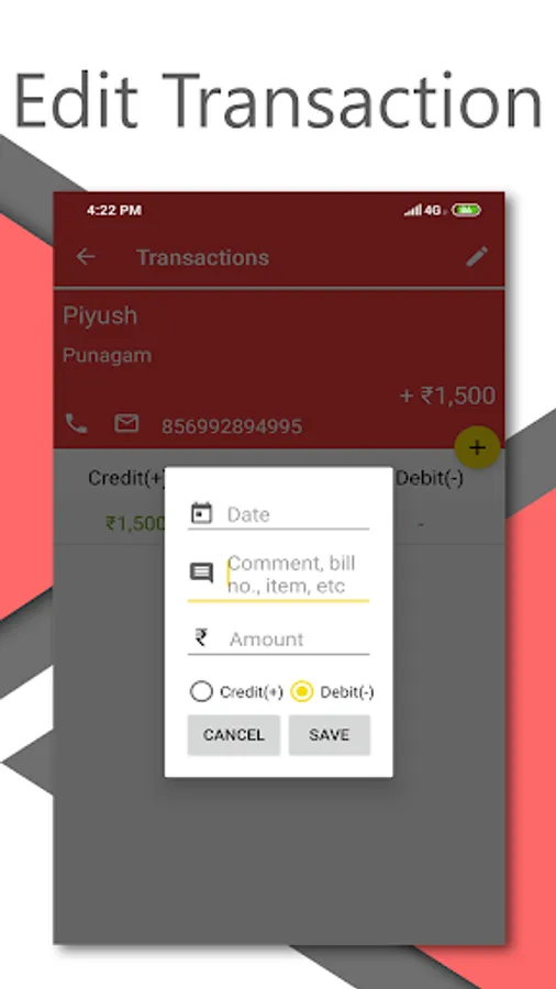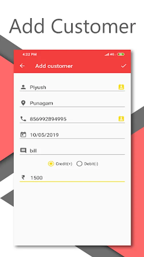 Then you have add Customer Name and Mobile Number and Select the date and the transaction type i.e. CREDIT or DEBIT, enter the amount, description and press ADD and your data will be saved.