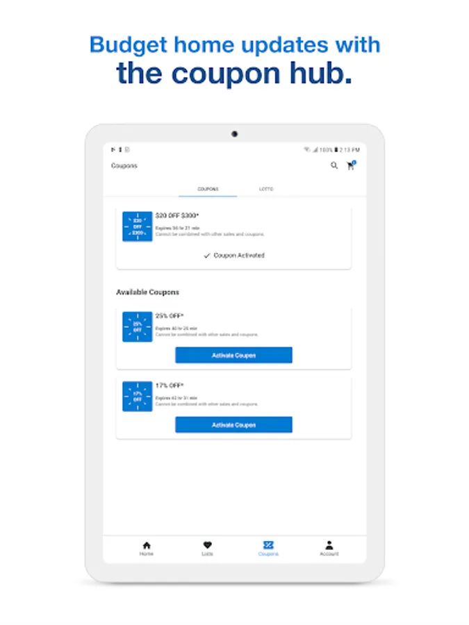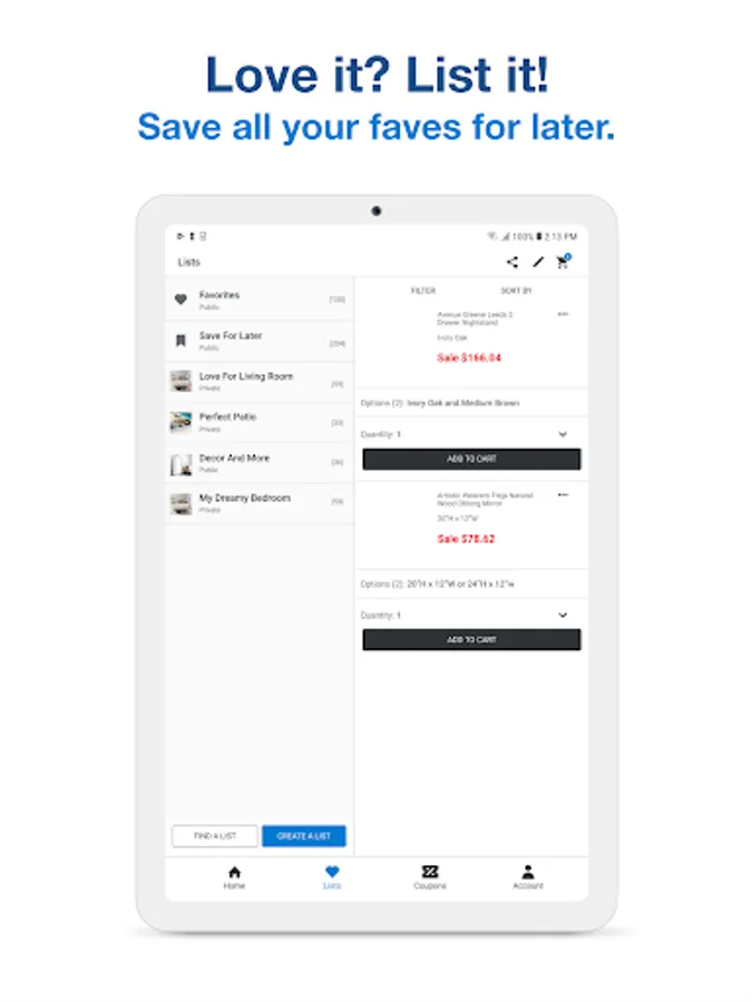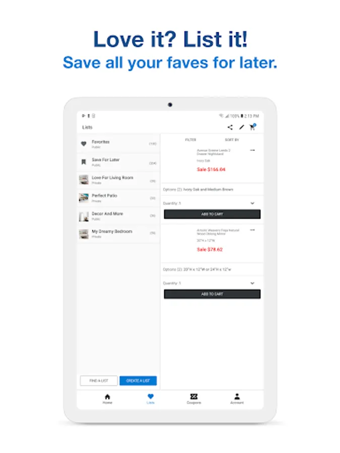 • Shop for furniture and decor with app-exclusive deals and discounts.