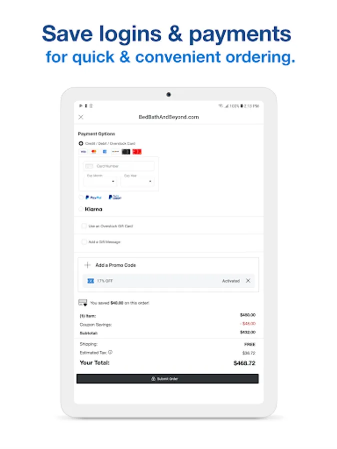 • Check out quickly and easily with saved logins and payments.