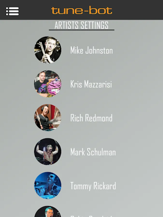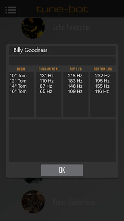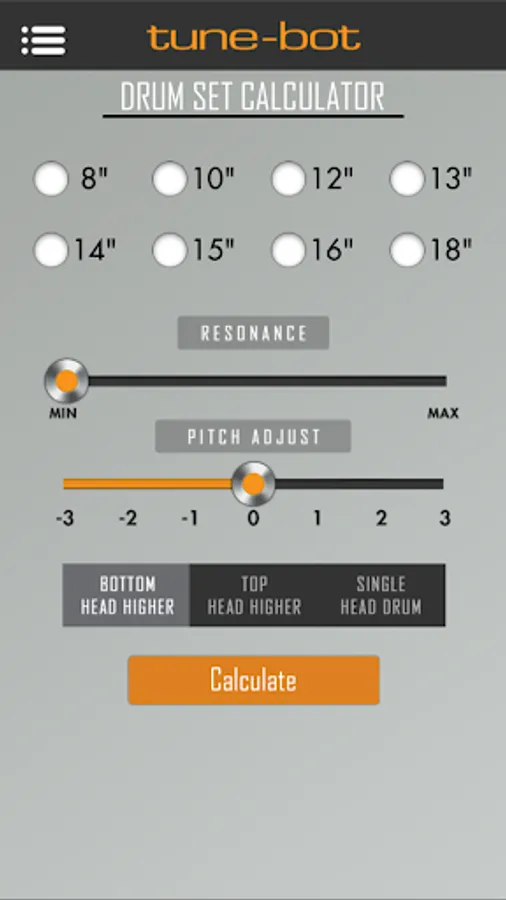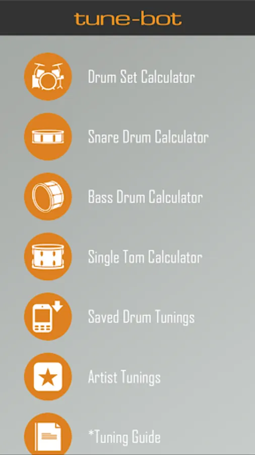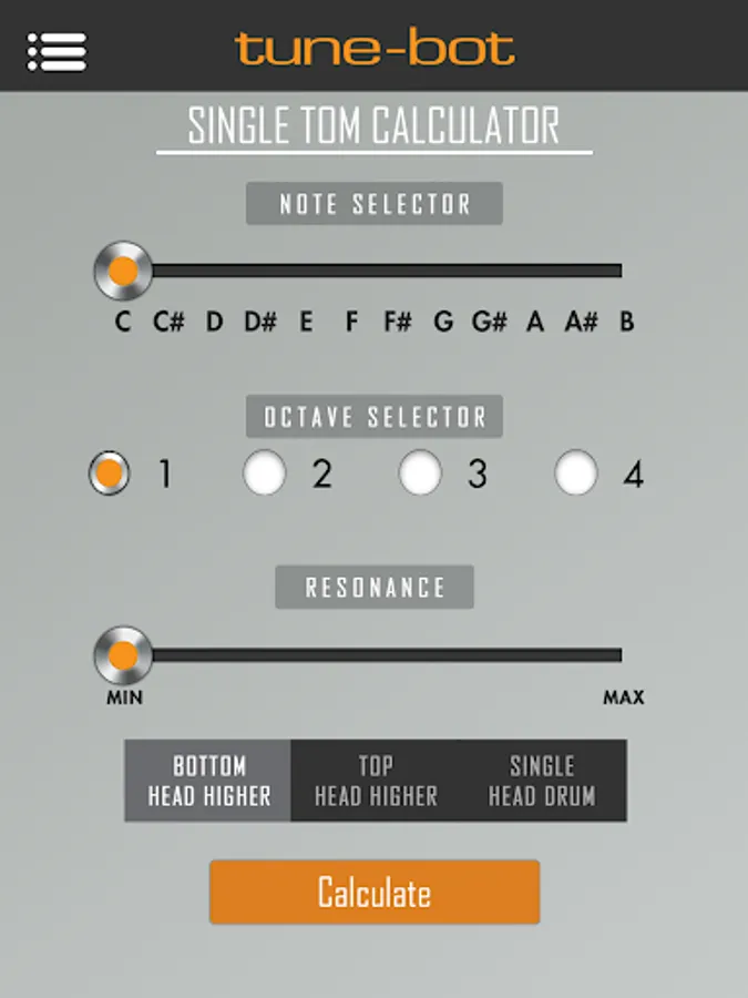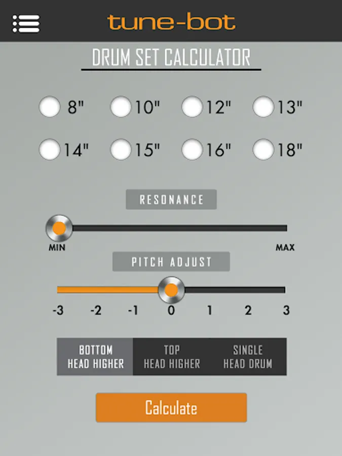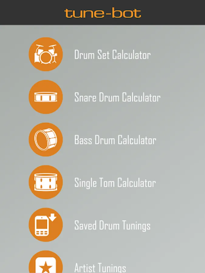 The tune-bot tuning calculator will help you determine the notes and frequencies to reach your perfect sound. Based on your drums and your personal preferences the tune-bot will provide recommended settings based on musical intervals. You can then use the tune-bot drum tuner to tune your drums to these exact settings. Also you can experiment with other tunings and try some of our “pro tunings” from the various tune-bot artists. After you’ve tuned your set to your liking you can save the pitches of all your drums to allow you to quickly re-tune to the same sound over and over again. No more guesswork!