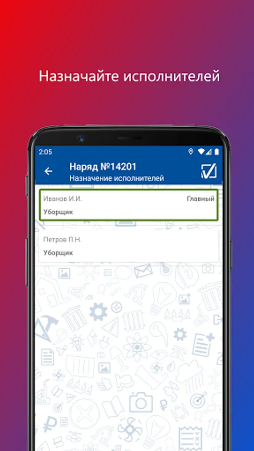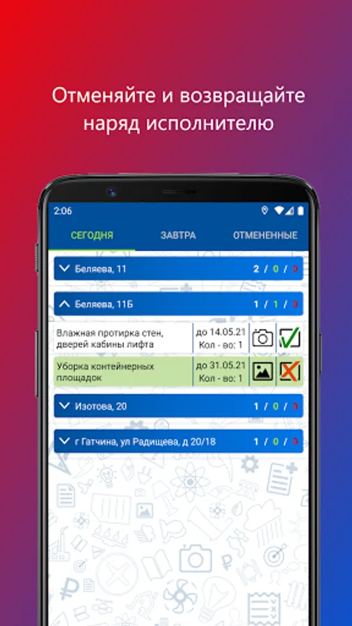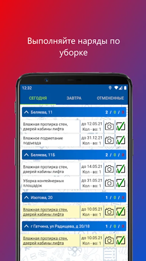 • Organization of work of cleaners of various objects. Demonstration on the phone screen of the daily job of the cleaner for today, tomorrow, as well as the possibility of photographing the performance of work. The foreman is given the opportunity to cancel poorly performed work with photographic fixation, as well as change performers in case of illness or temporary replacement. Implemented switching of seasonality of work.