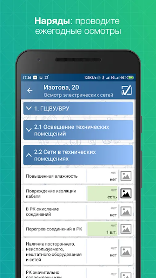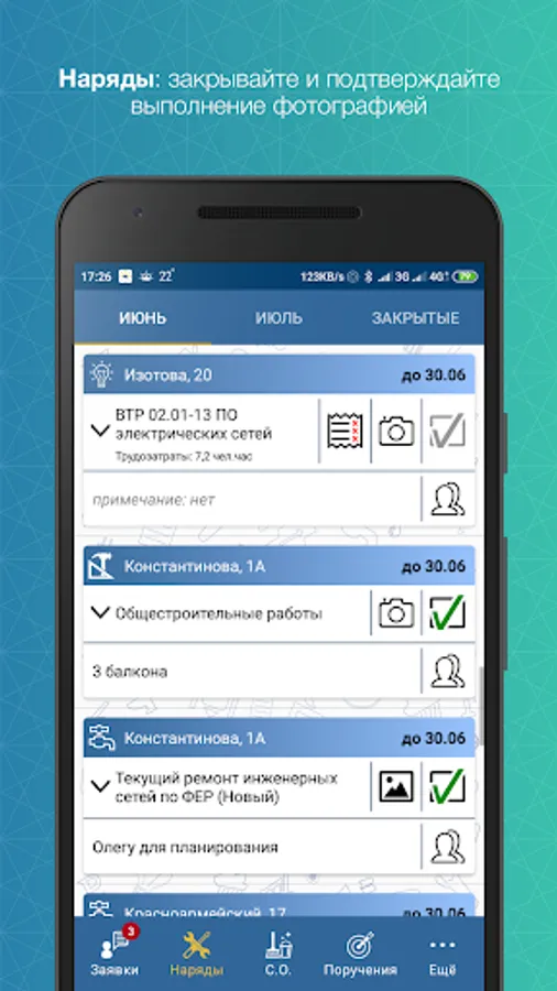 • Organization of planned work of specialists of working specialties and foremen. Performing scheduled maintenance work, recording the results of seasonal inspections with photo documentation. Work orders have deadlines, planned resource costs. The foreman is given the opportunity to change performers for the correct calculation of wages in the main information system. The functionality of the wizard allows you to clearly track the deadlines for the implementation of monthly plans by workers.