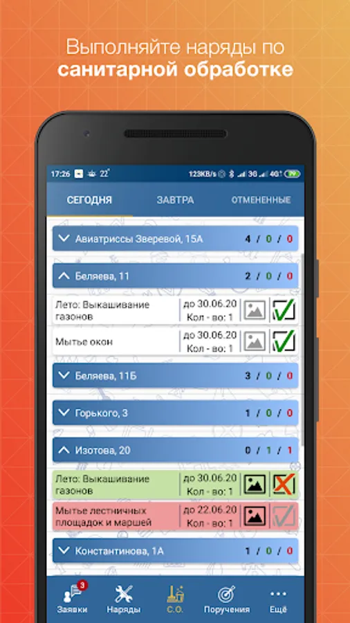 • Organization of work of cleaners of territories and apartment buildings. Demonstration on the phone screen of the daily task of the cleaner for today, tomorrow, as well as the possibility of photographing the performance of work. The master is given the opportunity to cancel poor-quality work with photo fixation, as well as change performers in case of their illness or temporary replacement.