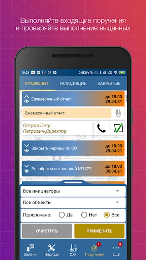 • Employees of the organization are given access to the block of mobile orders. Orders are issued by managers for their staff or are automatically generated in the form of cyclic calendar plans in the main information system.
