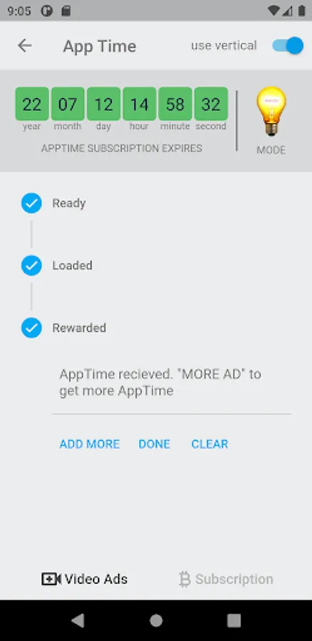 (b). Video ads which gives you few hours of appTime (uninterrupted use for a few hours). This means no ads will appear to interrupt your activities until allotted time elapse ...You can add as many appTime as possible