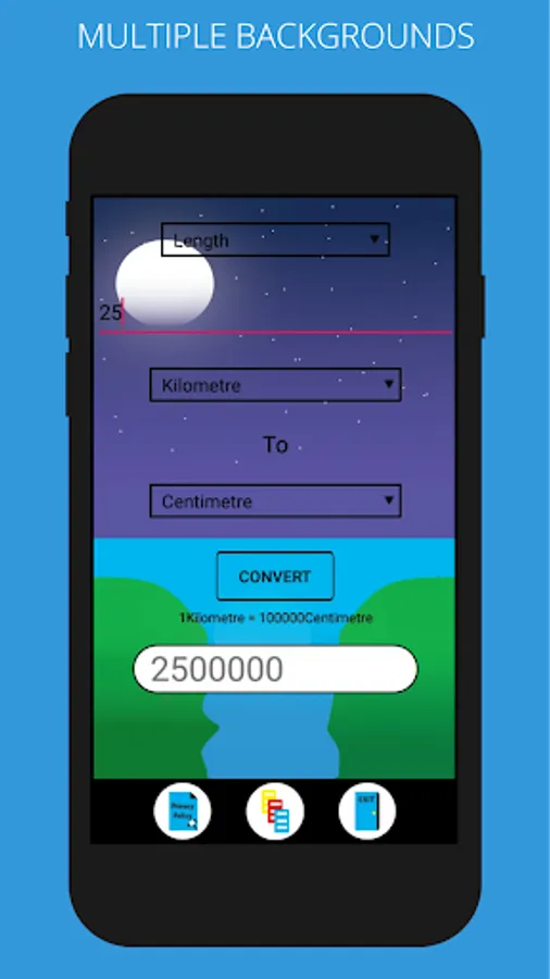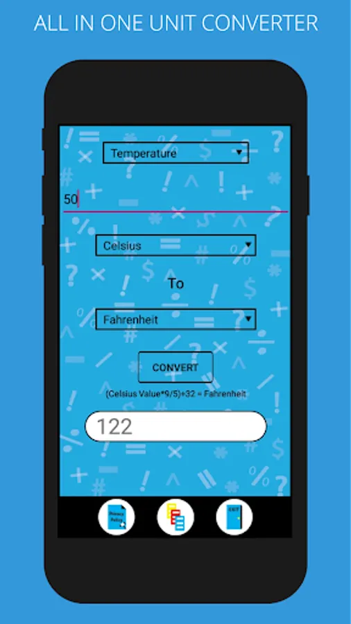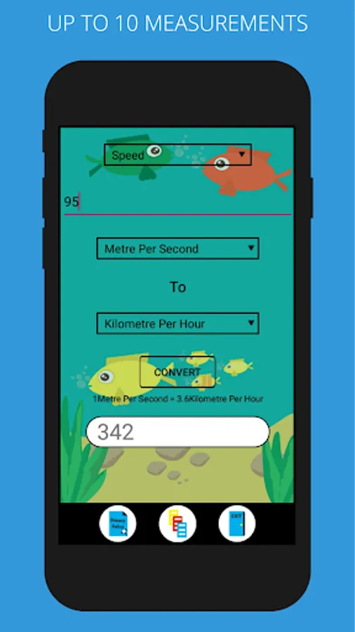 Convert many measure units, measures Including Length,Frequency,Temperature,Area,Time Energy,Mass,Pressure,Speed and Volume. Can Convert units Kilometre into metre , Degree into Celsius, Yard into Inch, Joule into Watthour , Metre Per second into Miles Per Hour and much more.