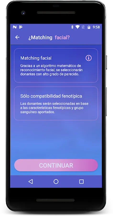 In addition to the introduction of the phenotypic data of the patient and the couple (optionally), the App gives the possibility of taking a photo of the patient, to carry out a facial matching with potential donors from whom the bank has eggs.