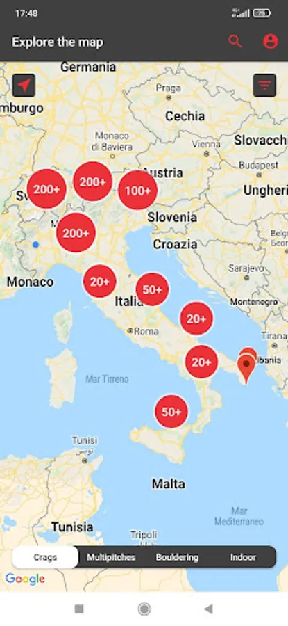 Please notice that in the free basic version the position of the crags and climbing spots is often approximate; the exact position is available only for purchased extra content.