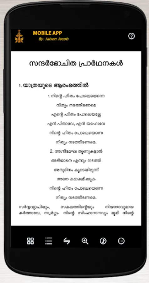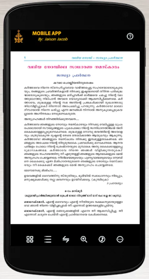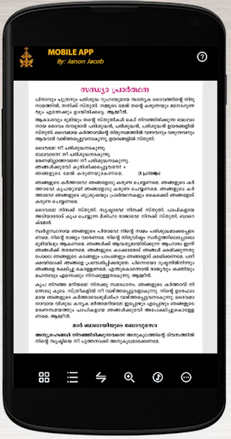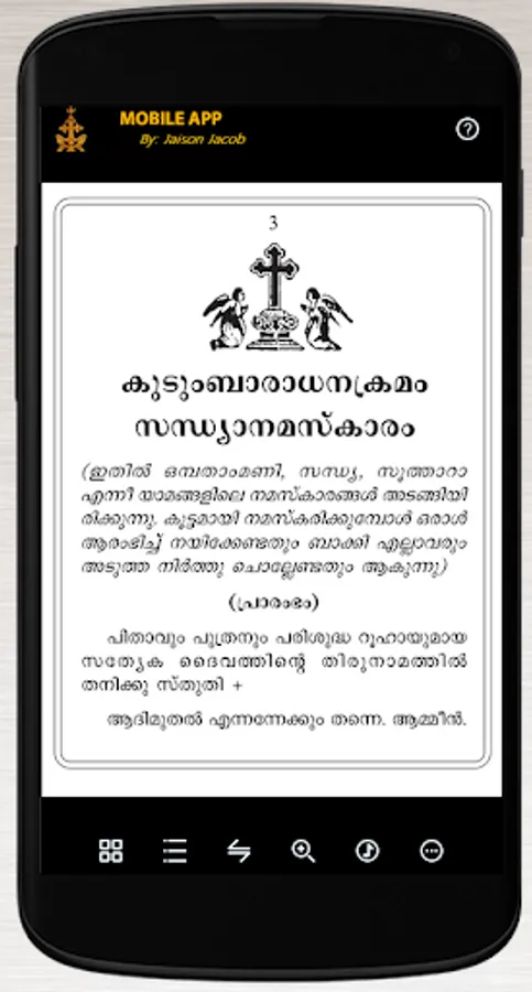 It is a Compilation of Indian Orthodox church Morning and Evening prayers . This is very useful pocket book for all Jacobite and Orthodox church believers.( Sandhya Namaskaram and Prabhatha Namaskaram )