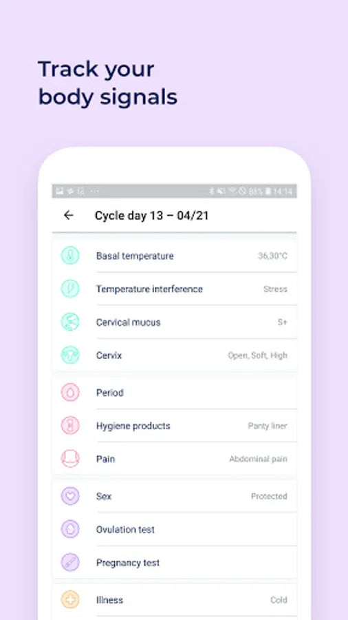 + Document other body signals such as cervical mucus, interference factors, ovulation test results, sick days to name a few.