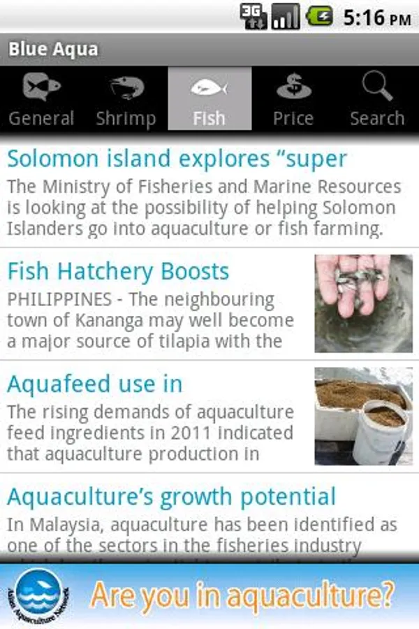 Blue Aqua Mobile Application is a user friendly tool that provides aquaculture industry's news and updates and shrimp prices. It is used for quick calculating of the important parameters in aquaculture operation such as, total biomass, feed conversion ratio (FCR), survival rate (SR) and free ammonia. The quickly computed results facilitate more effective monitoring of pond productivity and performance.