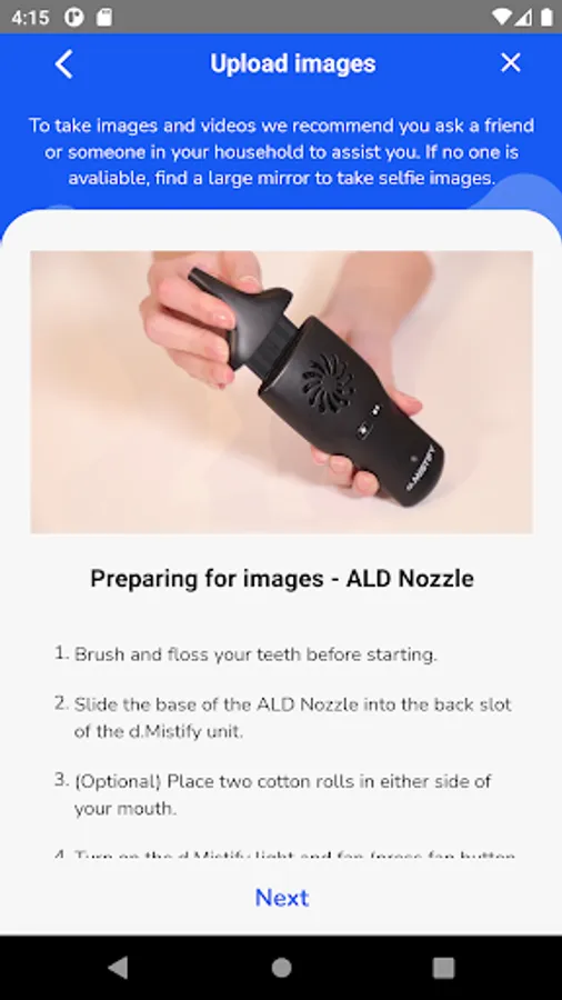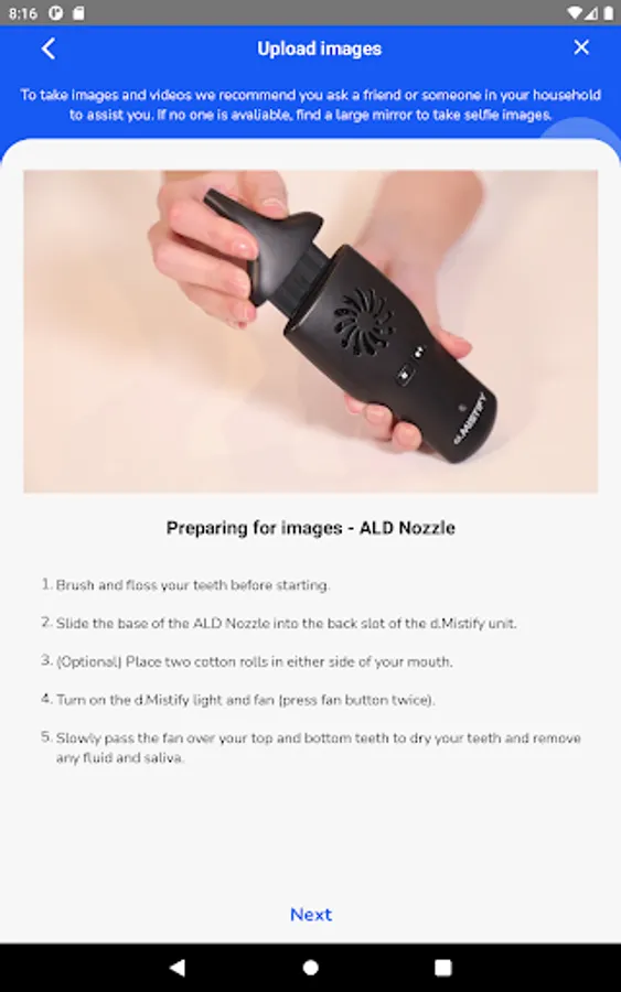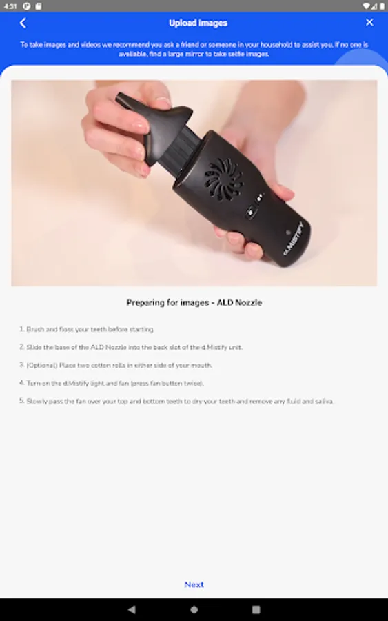 This app will guide you through taking high quality images to share with your dentist. Feedback from your dentist will be communicated through the app.